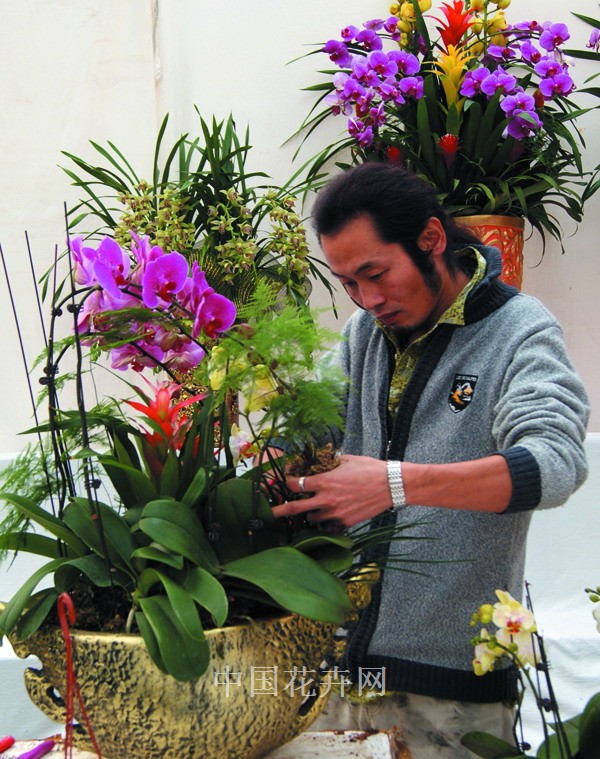北京花藝師廉兵正在制作做組合盆栽