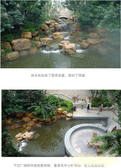 穿過規則式的廣場,進入園區部分。園區以用黃蠟石堆砌的水系作為主要景觀。水系周圍的小路用碎拼的鋪裝形式,道路蜿蜒曲折,配以兩側層次豐富的植物搭配,置身其中,給人自然、親近之感。水系利用5米的高差變化形成自然的疊水景觀,通過精心的景石碼放和植物配置,構成了匠心獨運的園林景觀。疊水兩側的噴霧效果,更加使人心曠神怡,流連忘返,形成自然、親和的景觀效果。