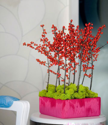 氛圍:紅果冬青可以入藥,應和節(jié)日氣氛的紅色小漿果用來裝點居室,歡快、喜慶,有著傳統(tǒng)的風雅韻味。馴鹿苔的顏色與粉色面料形成視覺上的反差,很適合中國年。