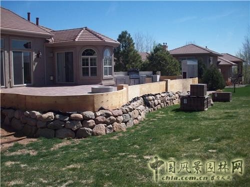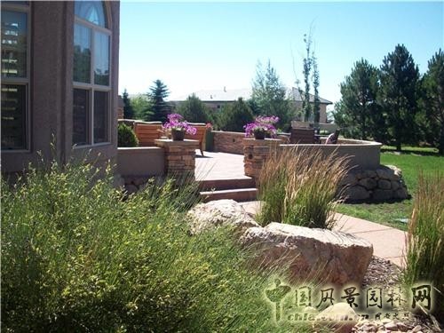 庭院位于美國科羅拉多州科泉市的高檔住宅,采用柔和的45度圓角曲線,設計彎曲環繞的半墻和通向壁爐的彎曲臺階,顯示出隨意典雅的自然風格。是作為娛樂消遣的場所,滿足進行多種活動,形成比較溫和的團聚氣氛。