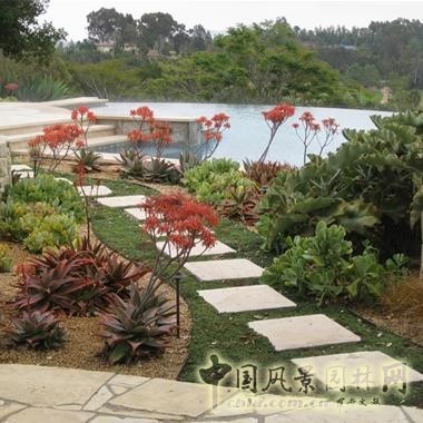 庭院位于洛杉磯市蘭喬圣菲鎮(zhèn)的小山上,設(shè)計(jì)的主要目的是室內(nèi)空間的延伸,創(chuàng)新性的設(shè)計(jì)是視覺(jué)上隱去了傳統(tǒng)游泳池單一的邊緣,擴(kuò)大了庭院面積。主要設(shè)計(jì)元素是無(wú)邊緣游泳池、多漿植物花園、石板汀步、灌溉系統(tǒng)、低電壓景觀燈、弧行臺(tái)階。