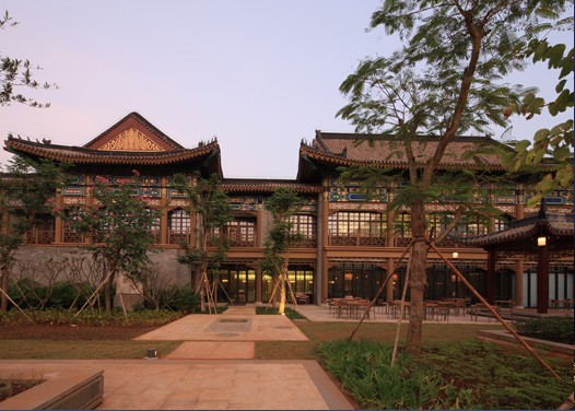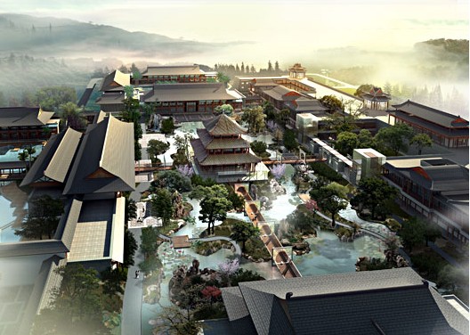 本項目為改擴建項目,原有建筑為仿古建筑風格,設計有客房,餐飲,娛樂,員工后勤服務區等功能,新建筑采用現代古建筑風格,擴建部分設有會議,客房,入口接待廳等功能,整體布局采用中式王府大院,群體布局,總平面采用嚴謹的中軸線對稱式布局,利用院落來劃分建筑空間,參照中式王府大院不同院落私密性,賦予院落不同的氣質,結合酒店功能的考慮對園林景觀進行特色設計,中央庭院采用王府后花園的布局,以精致的假山、湖水、綠化創造中色中香的傳統空間氛圍,會議中心,采用中式干院,景觀風格,配以極少量精致綠化,創造寧空間氛圍。新建客房區內庭院采用東南亞園林布局,創造浪漫熱帶泳池水景景觀。