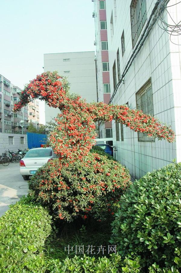近日,一株用火棘制作的"火棘鳥"成了鄭州某住宅區的亮點,圓形火棘球高4米左右,其頭、翅膀、尾巴俱全,作鳥兒展翅飛翔狀,造型自然生動,滿樹紅果營造出紅紅火火的喜慶氣氛。