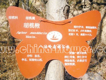 ▲橘黃色的蝴蝶造型樹牌上詳細標注了該樹木的植物學特性,讓游人在游玩中了解更多園林知識