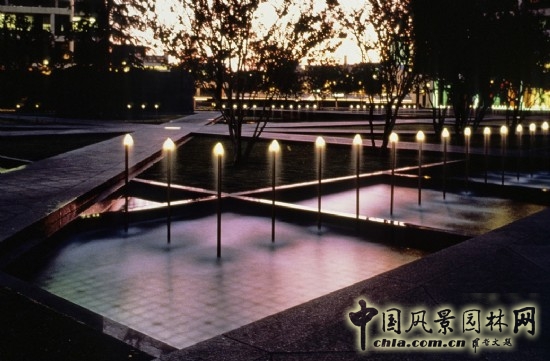 博內特公園(Burnett Park)是1983年PWP設計公司對建于1919年的一座城市公園的改建,位于美國德克薩斯州的沃斯堡市。公園的設計包括兩大基本的幾何形狀--高出草坪的花崗巖道路和水池矩陣。在光纖棒和小噴泉的作用下顯得靈活多變,小樹林和灌木,如橡樹、紫薇和木蘭等在其中閃閃跳動。公園還包括一個裝有照射光束的噴泉室和一面設計有四個青銅器浮雕的墻,緊連廣場。