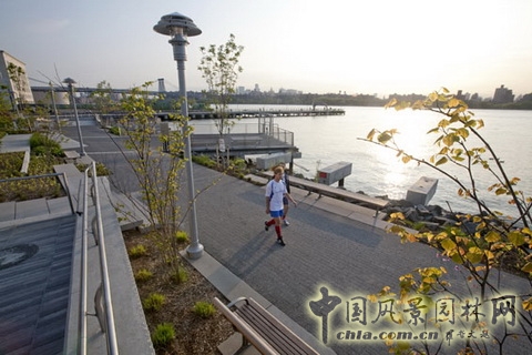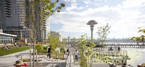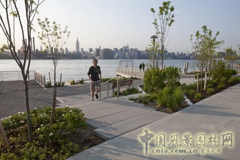 中國風景園林網訊 邊緣公園是美國弗吉尼亞州東南部城市威廉斯堡的新中心,由W建筑與園林公司設計,力圖創造一個交互作用的場所,形成一個持續的人與環境相互聯系的空間。邊緣公園強調了兩點,一是面對水緣之力,二是鼓勵公眾使用。在這里,城市網格與河流生態系統交匯、融合、碰撞:道路轉變成為綠色的行人道,車庫攀上了傾斜草坪,防洪堤緩緩與河水相接。這種在土地與河水之間模糊的邊界延伸至水濱,使內陸和社區受益。公園中多樣的休憩座椅區域,其設計的感覺像是被河水的涌流沖散開來。中心座椅區代領整個公園,迎接帝國大廈雄偉壯美的景觀。