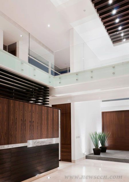 房屋采用了大塊玻璃窗和兩道側墻,將光照和視野引入到房屋當中,也將房屋與周圍的綠色地帶融合在一起。房屋采用了不同的材料,如大理石、花崗巖、木料和本地的石材等。懸垂的墻面和天花板以及遮陽板,加上玻璃和石材,塑造出溫暖和雅致的氛圍。