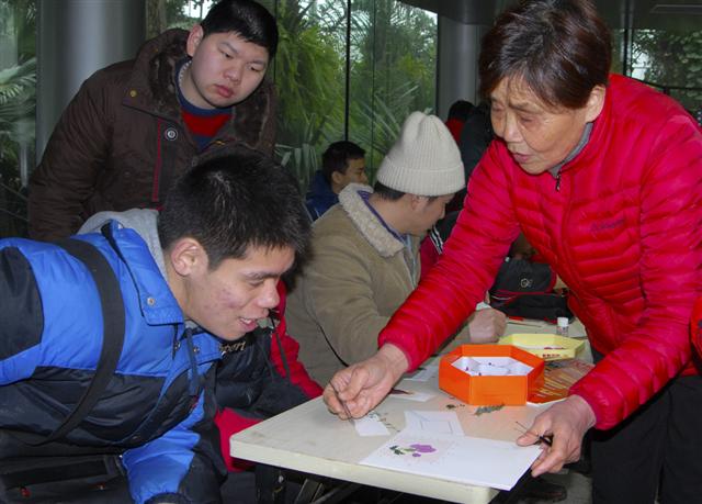 研究員金岳杏教授殘疾孩子制作壓花畫