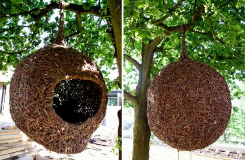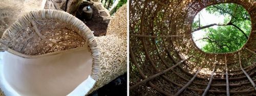 Porky的系列作品“weaver”s nests”沒有起支撐作用的鋼架結(jié)構(gòu)。每個(gè)大鳥巢都是用例如樹皮、樹枝等自然材料一點(diǎn)一點(diǎn)編織出來的。最終成形的作品十分堅(jiān)固,可以容納兩個(gè)成人。