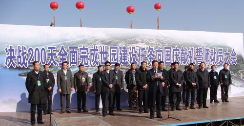 3月20日上午,2013中國錦州世界園林博覽會執委會在世博園園區建設現場,召開了“決戰200天,全面完成世園建設任務向國慶獻禮誓師動員大會”。 錦州市市長劉鳳海做重要講話,國家海洋局宣傳中心主任蓋廣生致辭,市委常委、沿海經濟區工委書記、中國錦州世界園林博覽會籌備建設指揮部總指揮長王廣明做動員講話,籌備建設指揮部工作部代表和工程建設公司代表做了表態發言。大會由錦州世界園林博覽會籌備建設指揮部常務副總指揮長李錦徐主持。