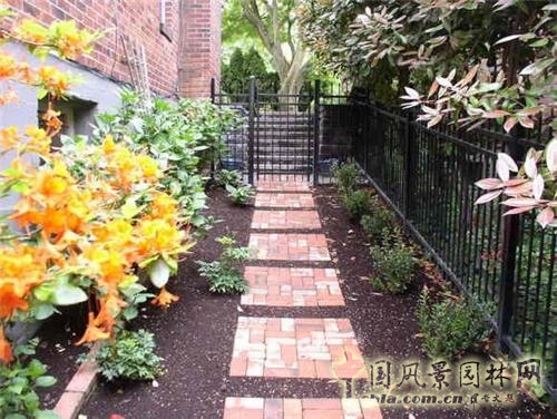 磚塊人行道通常是田園風格庭院的特征,粘土磚有一種古典的肅靜美。磚塊路設計形式有:正式的和非正式的;直線型和彎曲型;流水形組合圖、波浪形組合圖及其他圖形;混凝土粘合鋪設和直接拼接組合。通過不同的鋪裝排列順序表現不同的風格。