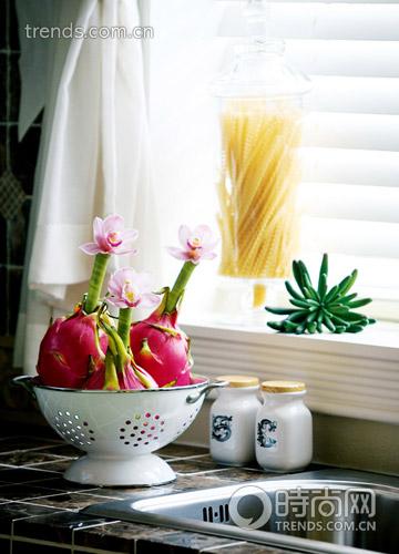 制作:用綠色絲帶纏起蕙蘭,再將其插入火龍果內即可。