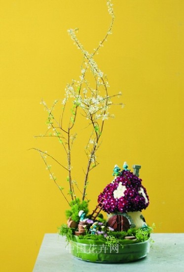 設計理念:昔日孩子們愛不釋手的寶貝,隨著他們年齡的增長,也一一被壓進了箱底。借由花藝設計,讓塵封已久的寶貝們重返夢中的森林,更讓我們的寶貝們回憶起童年的歡樂時光——雪柳在風中搖擺,精靈的香菇屋開滿美麗的撫子花,地面上的植物正綠意盎然地生長著。