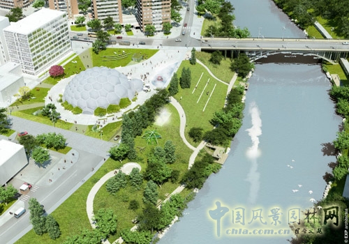 設(shè)計團隊對廣場進行了一些可持續(xù)性的調(diào)整。為了將該區(qū)域進一步擴展,項目進行了大規(guī)模的擴建,將河岸的生態(tài)系統(tǒng)朝向公共空間延伸。亭子安置在新的綠色空間的中心,由于伊莎貝爾天主橋的存在,亭子連接著市中心。廣場的地面稍加提升,隨和河岸的移動,營造出連貫的傾斜草皮地面,形成一種人造地形,為河岸朝向城市空間的遷移提供可能。