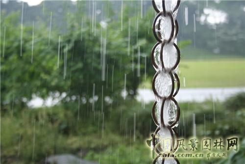 日式花園里另一個(gè)常見(jiàn)到的裝飾的雨鏈。既作為水槽的落水管,又是一道美麗的水景。常直接附在水槽上,雨水便收集到了一個(gè)盆地里,實(shí)現(xiàn)了雨水的再利用。日本已經(jīng)有很多年將雨鏈附在屋頂上收集雨水的歷史,在一些日式的寺廟里也常見(jiàn)到與其風(fēng)格相符的雨鏈。
