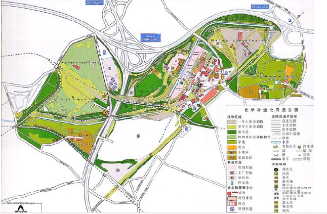 公園總占地面積230公頃(2.3平方公里),彼得·拉茲主持設(shè)計。他最大的特點(diǎn)是即保留了原來的設(shè)施,有通過新的元素的添加,創(chuàng)造出獨(dú)特的工業(yè)景觀是受到后現(xiàn)代主義的影響較深,同時還吸收了大地藝術(shù)思想運(yùn)用了生態(tài)技術(shù),解決了這一地區(qū)就業(yè),環(huán)境,居住和經(jīng)濟(jì)發(fā)展等諸多問題。為世界其他舊工業(yè)區(qū)的改造樹立了典范。
