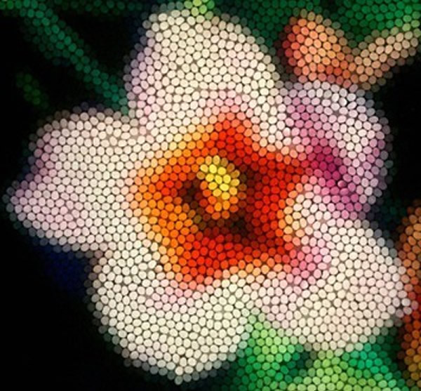 此圖顯示一朵人眼視為黃色的花在蜜蜂眼中的顏色