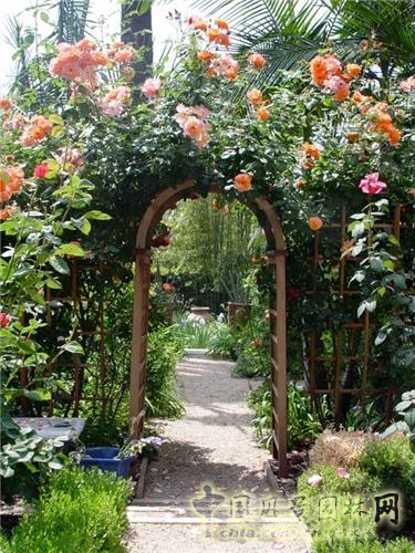 涼棚是另一個常見的裝飾結構。在鄉村花園里,木質或鐵質的彎曲涼棚有種歡迎來客的效果。根據需要,可以安裝一個簡易的大門與涼棚搭配。在涼棚上種植一些開花類的攀援植物,有一種鮮亮的感覺。而且,涼棚還可以增加花園的高度,或區分出一些獨立的空間。