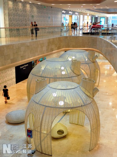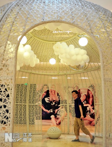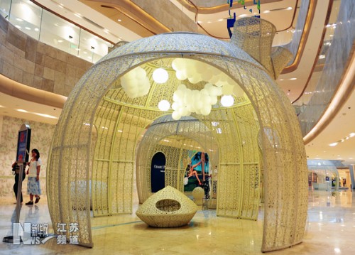 以“明天的花園”為主題的一組大型藤類編制環(huán)保裝置藝術(shù)品13日亮相南京德基廣場。這組藤編藝術(shù)品每個高約1至4米,由藤類材質(zhì)編制而成,將高端藝術(shù)與環(huán)保追求相結(jié)合,倡導(dǎo)回歸自然的健康理念。