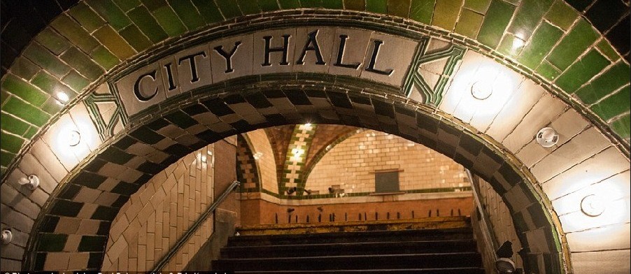 紐約市政廳地鐵站在運營之初,曾被作為紐約市區間快線(Interborough Rapid Transit)的南部終端。不過在隨后的幾十年中,因搭乘地鐵的市民越來越多,這個地鐵站已無法滿足運營需求,再加上其曲線形的軌道設計無法承載更快更長的新式地鐵,從而遭到廢棄。