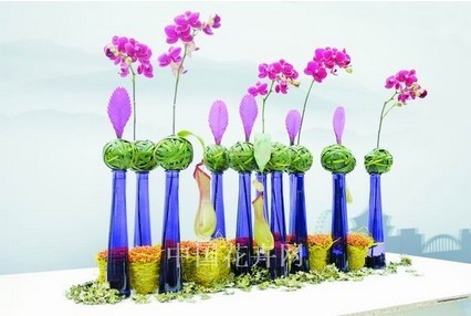 這是臺灣花藝師陳垂詢在荷蘭花展上所做的一組陳列裝飾設計。作品中的紫色高頸花器有些類似于我們常見的汽水瓶,因此家庭制作時可用汽水瓶代替,簡單又隨意。花器上的綠色球體是用產自臺灣的春蘭葉編織而成,設計師用竹簽將它卡在瓶口牢牢定住,幾支玫紅色的鐵蘭直直地插在球體之上,奇特的葉形傲人地展現在觀眾面前。紫色的蝴蝶蘭和豬籠草一上一下優雅地跳脫出來,使整組作品更顯柔和。值得一提的是鋪在作品下方的橙色“小茄子”,這種植物盛產于荷蘭,由于荷蘭人對橙色情有獨鐘,因此它在荷蘭非常流行。
