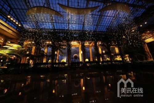 在溫室里面,橘園天花板上有六個大雪球自然垂落,每個吊燈直徑都超過9英尺,都有127小燈泡圍繞。