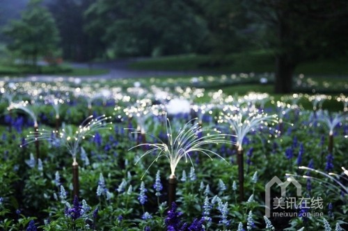 在湖面上Munro運用了閃光的CD漂浮在水面,仿佛在給睡蓮致意。在岸邊,7000森林的燈盞展現(xiàn)了它迷人的誘惑。