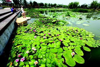 北湖濕地人為地在有一定長寬比和底面坡度的洼地上用土壤和填料(如礫石等)混合組成填料床,使污水在床體的填料縫隙中流動或在床體表面流動。同時在床體表面種植成活率高,抗水性強,生長周期長,美觀且具有經濟價值的水生植物,現已種植了蘆葦、蒲草、睡蓮等150余種水生植物,既美觀還起到了凈化作用。據測定,在濕地植物組織內富集的重金屬濃度比周圍水中的濃度高出10萬倍以上。