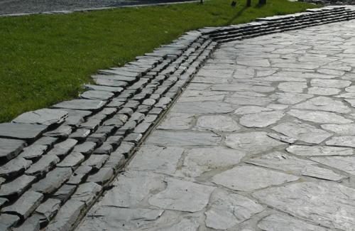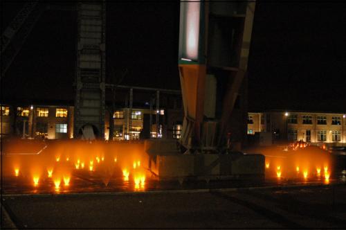廣場表面的鋪裝用各種大小的黑色板巖以各種方式鋪就。黑色的板巖是采礦時從黑金中淘汰出來的廢料,從礦山中取之不盡。鋪裝上面有照明設備,還有噴霧設備,有的上面還有水流。設計師考慮到以上的功能性之外,還利用鋪裝上的照明點綴夜景。夜景主要角色是礦場上面的兩個高大的塔。