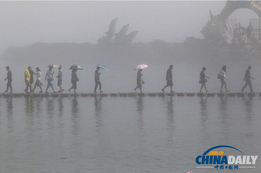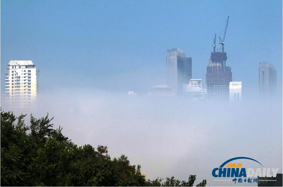 2012年8月2日,山東煙臺,濱海建筑在平流霧映襯下仿佛海市蜃樓。