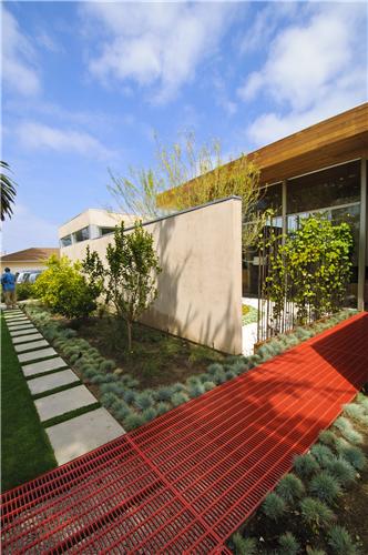 若想分享你喜愛的顏色,那么就盡量應用到前庭院的景觀表現中。圖上這條看上去是通向前門的小道實際上是晚上下面被點亮的爐排。這種顏色有強調的作用。道路旁的綠色高羊茅為這個熱環境提供相反的陰涼感。