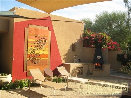 在這個現(xiàn)代化的沙漠景觀風(fēng)格的院落里,戶主很想要一些特別的東西。壁爐下面的長凳被粉飾以金黃色,有種張揚壁爐的效果。在戶外景觀中,黃色是愉悅的積極色調(diào)。在這里,搭配金黃色的是周圍地面的灰色巖石。而且,炎熱地區(qū)應(yīng)用這種顏色還有另一個優(yōu)勢:它不會像其他深色一樣吸收吸收大量的熱,從而可以確保座椅不會炙熱難坐。