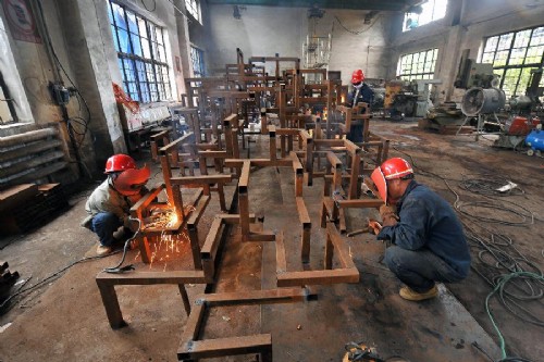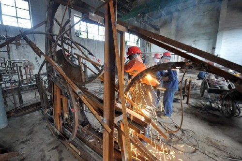 工人們在大同市工業遺址創意文化產業園區內焊接工業雕塑