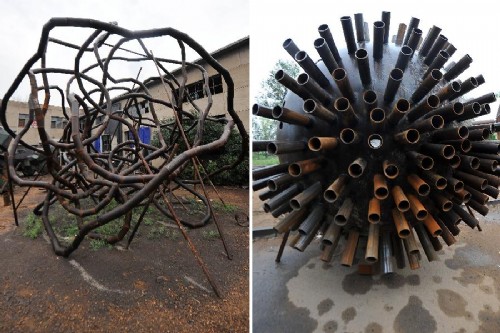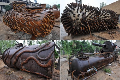 近日,一組由廢棄的鍋爐、扭曲的鋼管、銹跡斑斑的齒輪等廢舊工業零部件制成的創意雕塑亮相山西省大同市工業遺址創意文化產業園區,吸引著過往人群的目光。據了解,這些雕塑由中央美術學院的27名藝術家和40多名焊接工人花費1個多月的時間制作而成。藝術家們的創意旨在呼吁人們清理工業金屬廢料,保護城市人居環境。