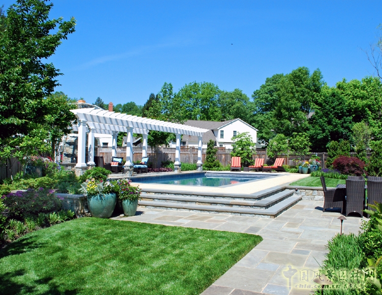 還有很多細節:石頭墻和地鋪圖案中都鑲嵌滿了2英尺厚的石板,墻壁頂部和柱子達成的蓋、定做的柵欄、涼亭和棚架式長廊修飾完成。一個真正的設計緊張的開始了。
