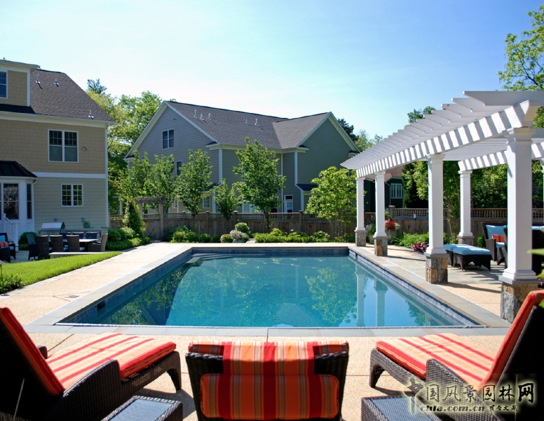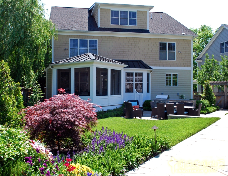 棚架式的長廊有足夠的空間用做進餐區和休息區。燒烤位置設在一角,方便把AC單元藏在下面,烤架被放置在一端,毗鄰一個超大的餐廳露臺。草坪擁有曲線美,種植的特點是每個季節都有鮮花盛開。