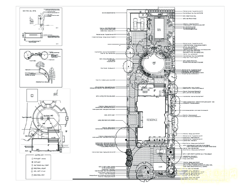 這是一個極好的項目,同時也有一個優(yōu)秀的委托人。委托人的想法很多,希望能夠充分利用周邊的景觀,包括一個上層陽臺、有屋頂?shù)闹型ァ菊?、壁爐、能夠搭帳篷那么大面積的草坪,能夠容納兩輛車的車庫,一個游泳池和大面積花木。所有這些剛好融入115英尺X75英尺這樣一個空間。