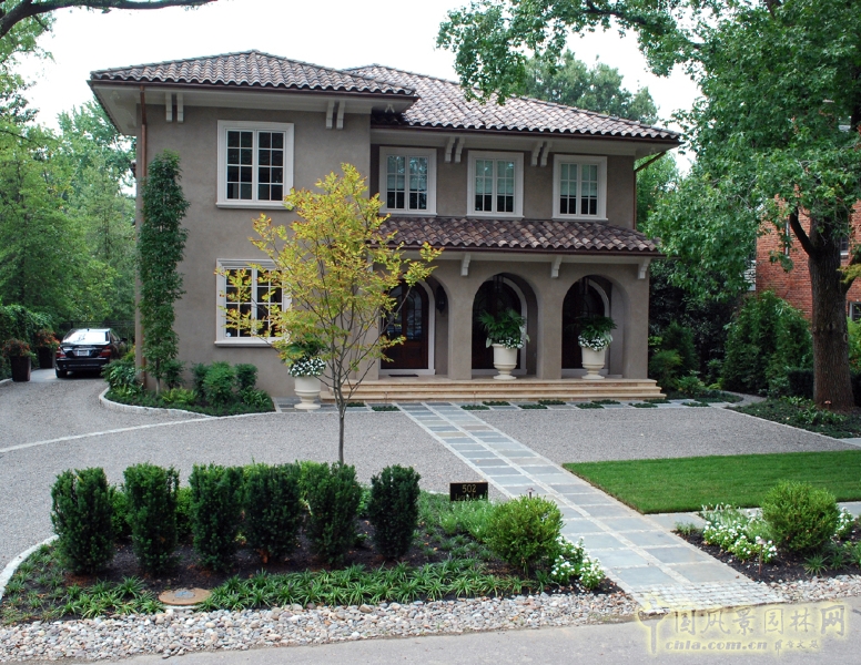 委托人是一對充滿時尚感的夫妻,有兩個學(xué)齡期的孩子。他們希望室內(nèi)裝飾傳統(tǒng)元素和現(xiàn)代風(fēng)格。第一件事就是要和建筑師把添加陽臺的細節(jié)敲定。在原有基礎(chǔ)上擴大了上層陽臺空間,以便于容納一個餐廳,并為用戶量身設(shè)計制作欄桿。一條14英尺寬的石板鋪置的甬路直通到庭院中。