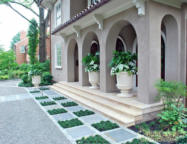 樓梯長廊盤旋猶如愛人的手臂,這里有足夠的空間容納4張躺椅和8個人用餐。游泳池靠著一條16英尺長的灰泥墻邊,墻頭倒掛著8英尺寬弧線傾斜的瀑布,可以從房中觀看到此景。完全完成修整的車庫添加了一道法式庫門,亦可做另一種功用——泳池別墅。橢圓草坪上樹籬設計遮住了車道的視線。兩株高大的寬幅刺槐樹冠為池塘遮陰,削弱了日光對車庫的照射。一株光葉櫸樹樹冠正對二層屋檐一角。多年生植物,一年生植物和草本植物布滿整個花園,郁郁蔥蔥,猶如一個調色板,讓整個花園充滿色彩感和地中海混搭式的紋理感。