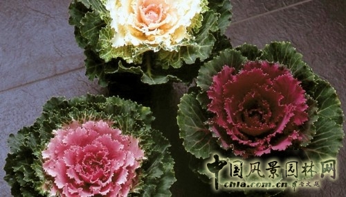 2012美國Takii種子公司最新研究顯示:溫度在55-60華氏度范圍時,羽衣甘藍開始變色,其卷曲的葉片可變成暗粉色、枚紅色、白色,像一朵大花綻放在綠色葉片間。太陽下觀賞植物的合適尺寸為:高25cm-36cm,直徑36cm-43cm。羽衣甘藍葉片卷曲向上生長的獨特性決定了它可以將雨水收集到下面的蓮座里,從而在雨天仍能保持較好形態。