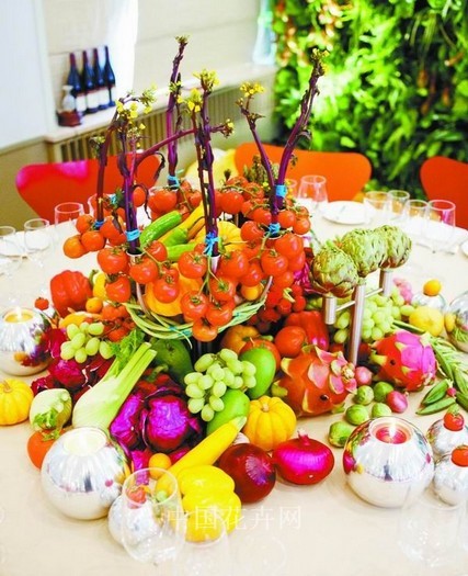 蔬果為何適用于宴會餐桌設(shè)計:克里斯汀主要承接高端婚禮和宴會的花藝設(shè)計業(yè)務(wù),相對來說,婚禮花藝設(shè)計追求浪漫,最適宜用鮮花表現(xiàn),而宴會花藝設(shè)計則追求氣氛的熱烈和融洽,尤其是餐桌花藝的設(shè)計,要讓賓客心情愉悅,胃口大開,新鮮的蔬菜和水果就可以大顯身手了。尤其在公司內(nèi)部聚餐和家庭宴會設(shè)計中,蔬菜水果的運用倍顯溫馨親切。