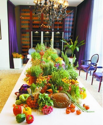 案例2:近日,在一個高檔小型商務(wù)聚會中,克里斯汀以6個自然元素的主題設(shè)計了6張圓形餐桌,包括香料植物主題、中式庭院主題等,其中之一就是蔬菜水果主題。這張餐桌的主要設(shè)計材料就是茄子、西紅柿、黃瓜等。(見圖1)
