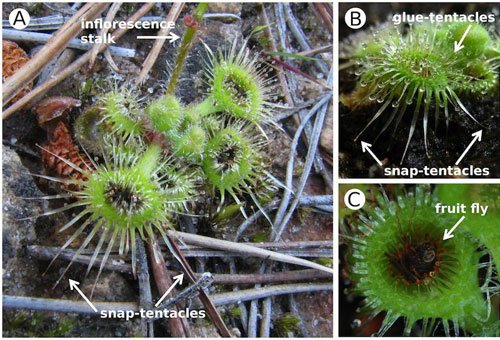 粘性毛氈苔的陷阱葉片上覆蓋著粘性觸須,一些小型動(dòng)物一旦粘在葉片上在幾分鐘或幾小時(shí)內(nèi)就被包裹起來。這種圓葉結(jié)構(gòu)的毛氈苔生長在營養(yǎng)缺乏的澳大利亞黑森林沼澤地帶,這里也生長著捕蠅草。此外,這種植物葉片上還長有一種非粘性捕食觸須,一旦獵物被粘在性性葉片上,這個(gè)非粘性捕食觸須便在75毫秒內(nèi)朝向獵物目標(biāo),其速度快于著名捕蠅草的捕獵動(dòng)作。