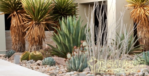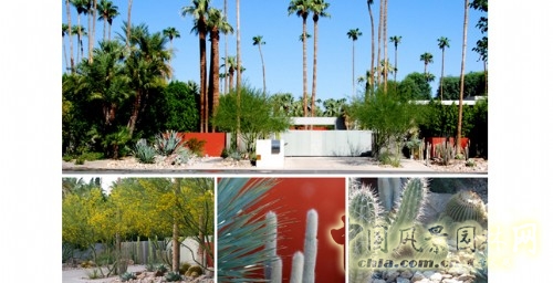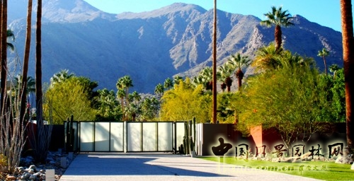 景觀設計師想讓花園同時成為一道街景,并展示給公眾對沙漠植物更多的認識,而不是要將花園隱藏在高墻內(nèi)。為創(chuàng)造一個入口花園,特意將大門設計地遠離路面44英尺,就空出一片寬85英尺、長44英尺的入口花園,主要種植展示沙漠植物。