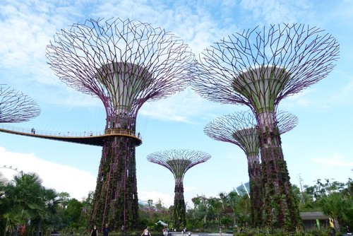 擎天大樹(Supertrees)是由18座樹形結構的塔狀垂直花園組成,高度在25米至50米之間(9-16層高)。建筑設計從熱帶雨林中的優勢樹種中汲取靈感,將成年樹的外形和功能相結合,不僅可支持植物的生長,還能通過科技手段模擬樹木的生態功能。這18棵擎天大樹的“樹干”外部是別具特色的垂直綠化,通過各種熱帶攀緣植物、附生植物和蕨類植物的覆蓋種植,模擬熱帶雨林中 “空中花園”的美麗景象。巨大的“樹冠”在白天可以遮蔭、收集雨水,其中一部分“樹冠”與植物冷室系統相連,發揮著通風和水循環降溫的功能。另一部分“樹冠”則安裝了太陽能光伏電池,吸收太陽能,供夜間燈光照明。充分表達了城市對自然的向往,對當今環保能源的開發利用起到了引領作用。
