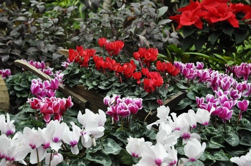 仙客來是此次花展的主打花卉。1200多株仙客來落戶展覽溫室,紅色、玫紅、粉紅、白色、紫紅火焰色,還有各種混色,色彩絢麗,花型奇特,十分討喜。