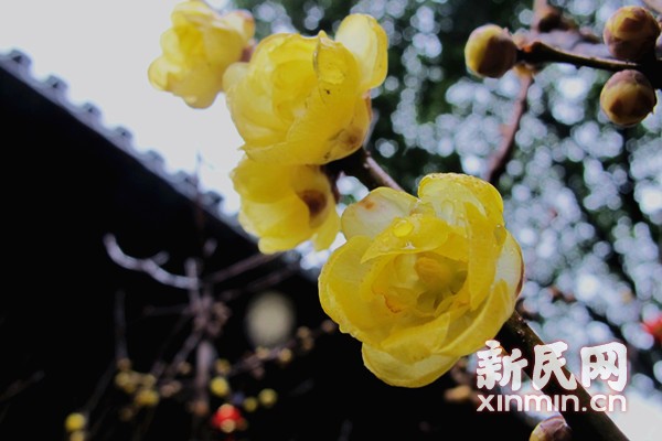 圖說:“上海三寶”之一的滬上傳統名花——外岡蠟梅含著水珠靜靜綻放。新民網記者 袁蓉 攝