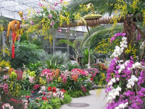 植物園內的展覽溫室是熱帶蘭展區的所在地。在展區內,本屆蘭花展的主題“美麗家園“將在這里展示的淋漓盡致。展區內共布置了七處景點,通過景觀配置讓大家感受到蘭花與生活、家居、自然的協調之美。