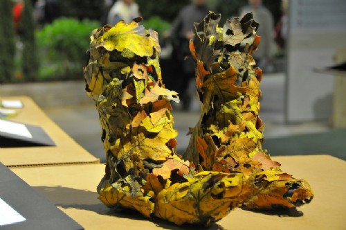 在美國芝加哥花卉園藝展上展出的用樹葉形狀的飾品裝飾的鞋。