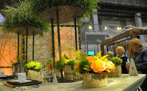 在美國芝加哥花卉園藝展上,參觀者觀看用鮮花裝飾的餐桌。